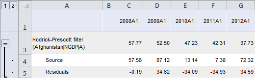 After the method is applied, a series with the name of the Hodrick-Prescott Filter(<Series_Name>) type and containing calculation results is added to the data table for each of the selected series. For example: