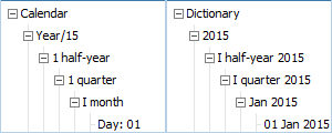 After executing the example a new custom attribute is added to the calendar dictionary. This attribute is assigned as a element name attribute. Elements of all levels are displayed with names of various formats (left) that differ from the standard ones (right):