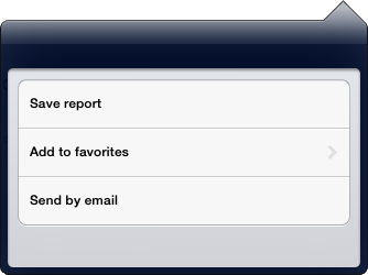 Settings menu is used to change parameters of the views displayed in a mobile application window, and to execute operations with them. For example, express reports, dashboards and regular reports have the menu that enables the user to save a report, add it to Favorites and send by email:
