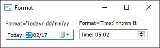 The value of the Format property is set using the combination of the following constants. All other characters are identified as text and displayed in the component without changes. If it is required that one or several constants are considered as text, determine them between escape apostrophes. For example, on determining the hh 'h' mm 'm' format the following value is displayed: 10 h 35 m.