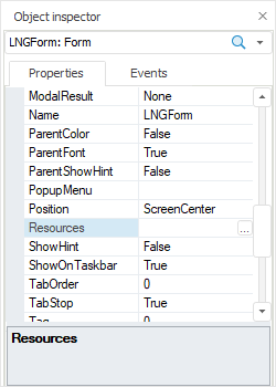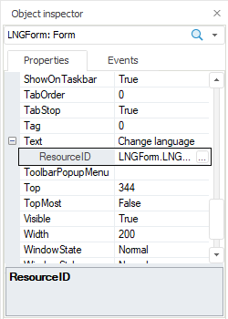 Specify the previously created ResForAppl resources in this dialog box and click the OK button. This adds the additional ResourcesID attribute to string data type properties of all visual components in the object inspector. This attribute value is generated automatically: