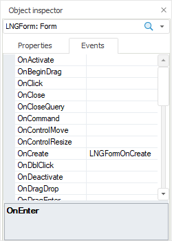 Double-click the cell corresponding to the OnCreate event. An event handler with the LNGFormOnCreate name is created.