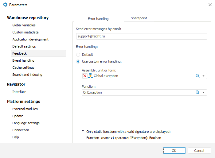 Default. On working, Foresight Analytics Platform will use the built-in mechanism of error handling: if error occurs, the appropriate window with information about error and ability to send it by the specified email.