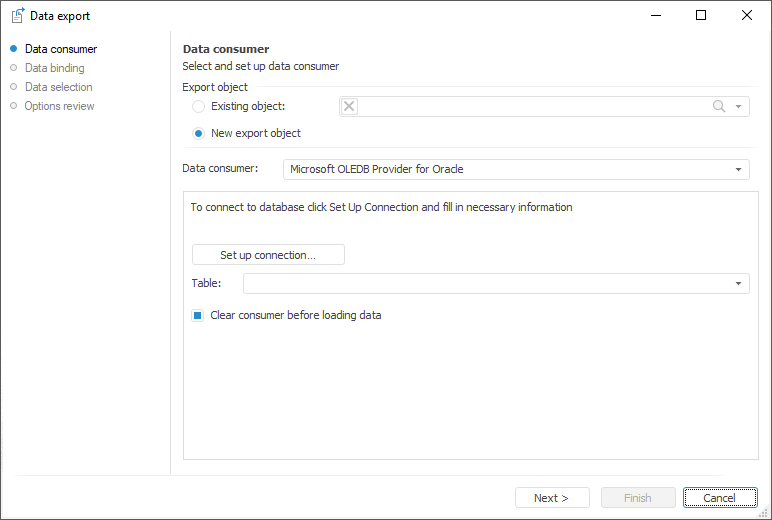 Data Consumer. Select the data consumer type. After selecting the type, its setup parameters are displayed. A set of parameters depends on the consumer type.