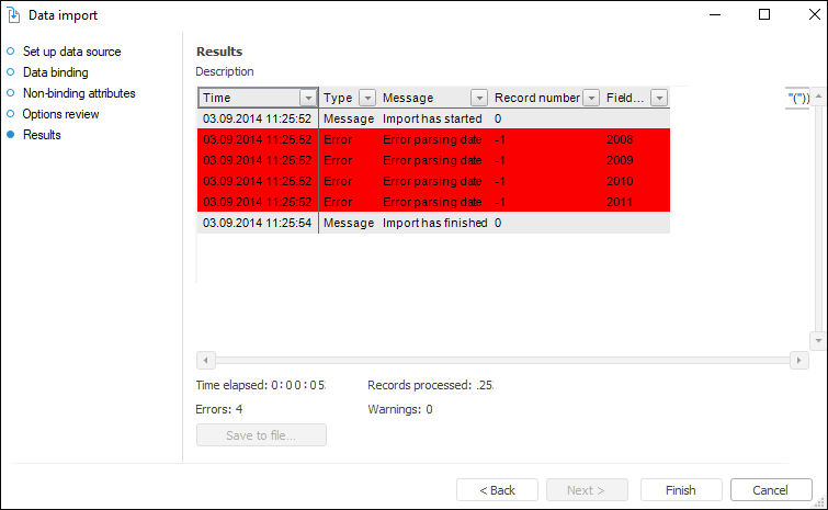 Finish data import results viewing and click the Finish button to close the Data Import object.