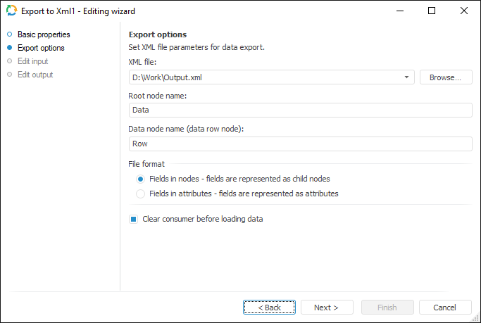 Specify name of the mandatory root element of the output XML file in the Root Node Name box, and the name of data containing element in the Data Node Name box.