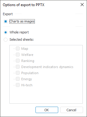 On exporting to PPTX presentation, each printed table is exported to a separate slide. Charts and maps are also exported into separate slides as images.