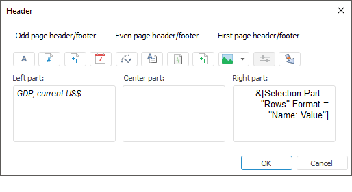 After executing these operations, the data area header is displayed in the left part of header or footer, the dimension selection is displayed in the right part on even pages.