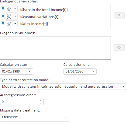 Endogenous Variables. Create a list of variables, tested for cointegration. The list contains all selected variables by default. At least two endogenous variables are required to execute the test.