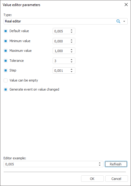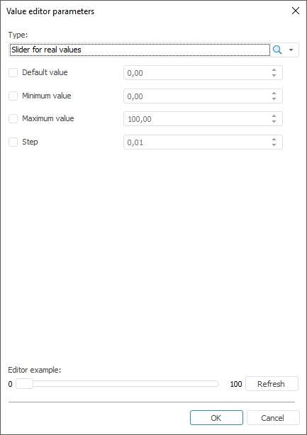 Default Value. Determine the editor value to be displayed by default. This value must be in the range of available values determined for the editor. If the range of available values for the editor is not set, the value must be in the range [-5.0 x 10-324; 1.7 x 10308].