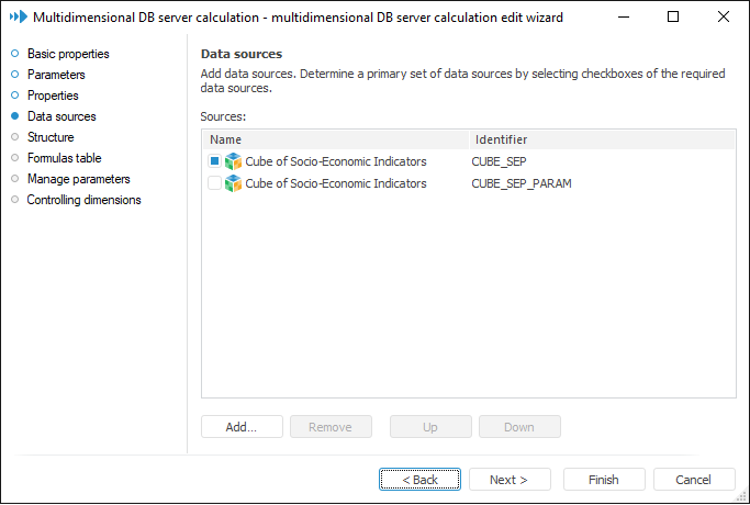 To determine data sources of multidimensional calculation on DB server and their primary set, go to the Data Sources page.