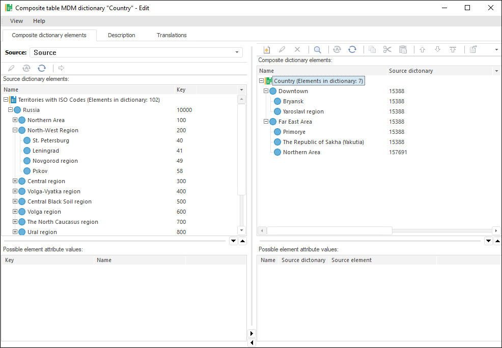 Table MDM Dictionary. The dictionary is used for creating a structured data presentation with possibility of its transformation. Creating a dictionary does not require a data source. Data can be entered manually or loaded from the data source to the dictionary by means of the built-in ETL tools. Dictionary elements may change in time, that is, may have several versions. Table MDM dictionary can be created in any place of repository, not only in the MDM repository. A table MDM dictionary that uses a single table to store data. A table is created automatically on creating a dictionary and is the dictionary child object. The table fields correspond to the dictionary attributes. Creating a table MDM dictionary requires a database to store dictionary data that is located outside the MDM repository: