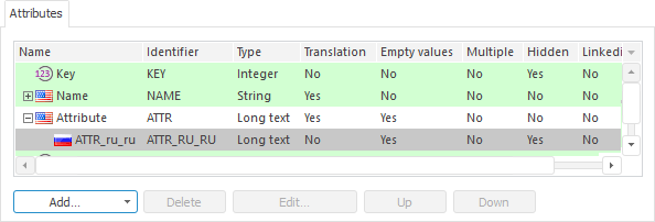 If the Translate Dictionary Into Other Languages checkbox is selected, the icons of attributes of the String and Long Text types requiring translation are replaced with the flag of the country that uses the current translation language as its official language.