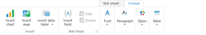 The Text Sheet.Format ribbon tab becomes available when a text sheet is active. This tab is used to insert objects into a text sheet and set up their parameters.