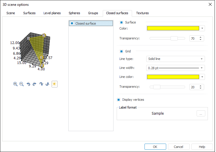To set up closed surfaces parameters, go to the Closed Surfaces tab of the 3D Scene Options dialog box: