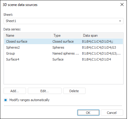 Each 3D scene object (surface or spheres) is a data series, for which a data source must be determined. Source rows contain series points (or vertices of a multidimensional shape), while columns contain coordinate values (X, Y, Z) and point radii.
