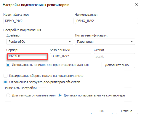 В окне «Настройка подключения к репозиторию» введите параметры, в том числе IP-адрес виртуальной машины: