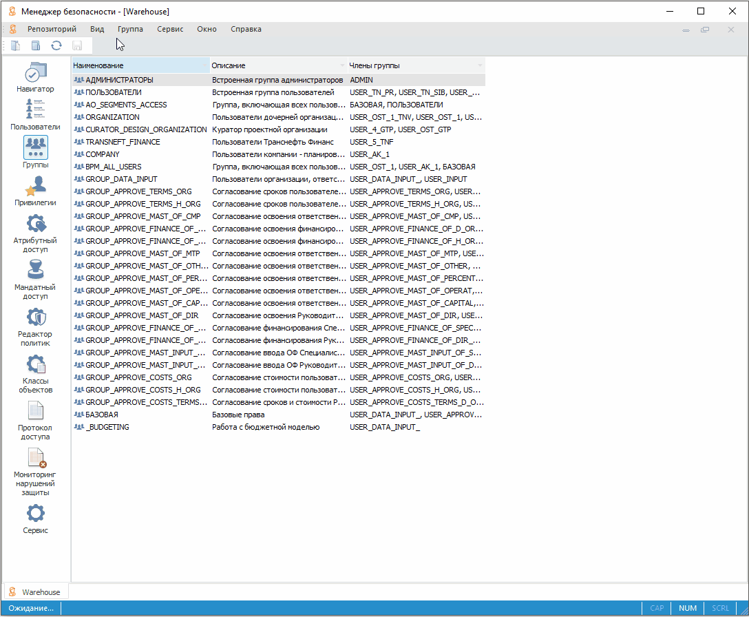 Создание групп пользователей выполняется с помощью стандартных инструментов менеджера безопасности «Форсайт. Аналитическая платформа».