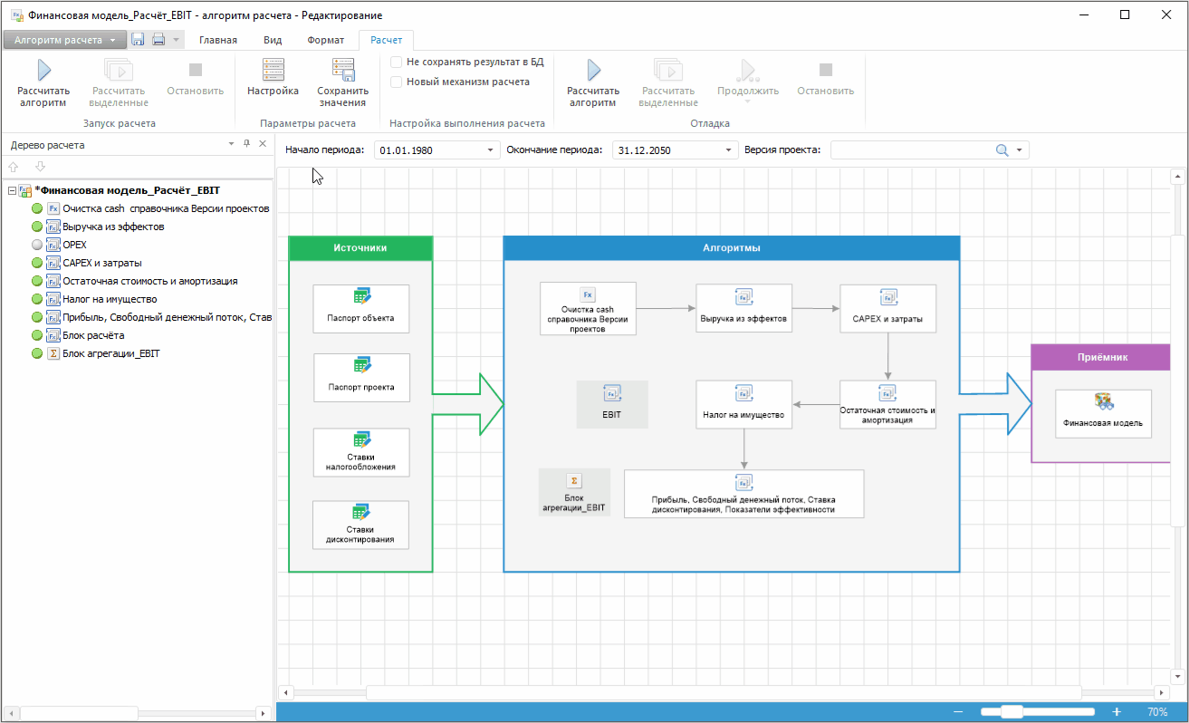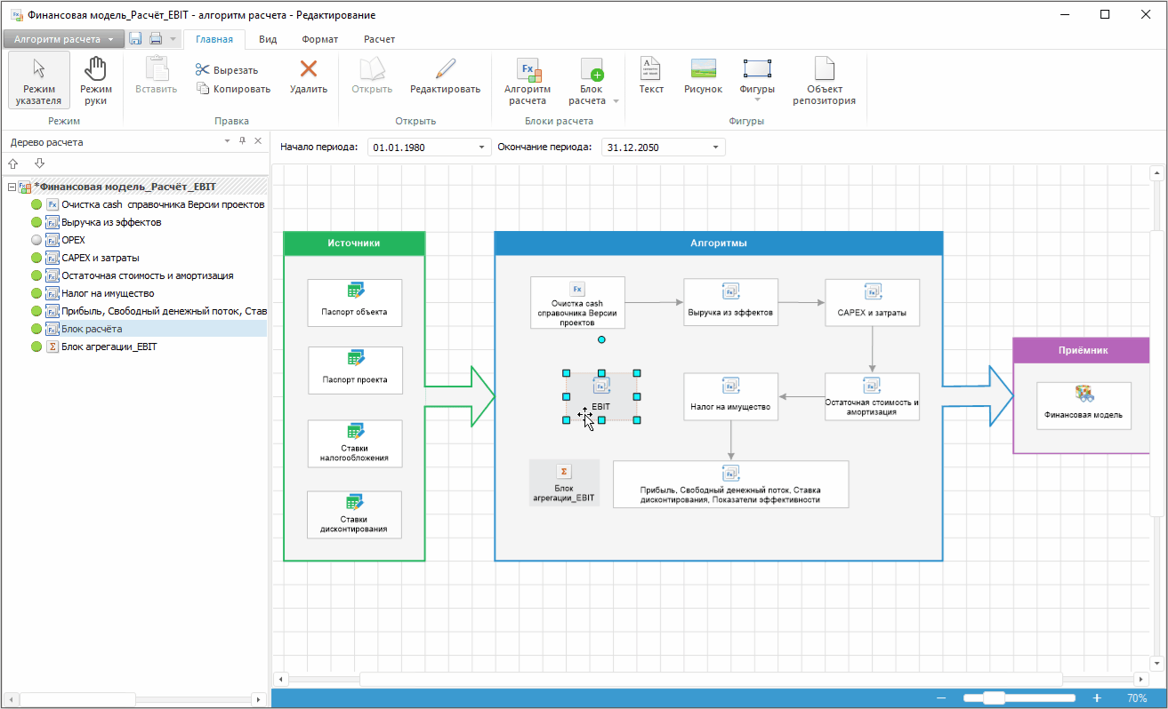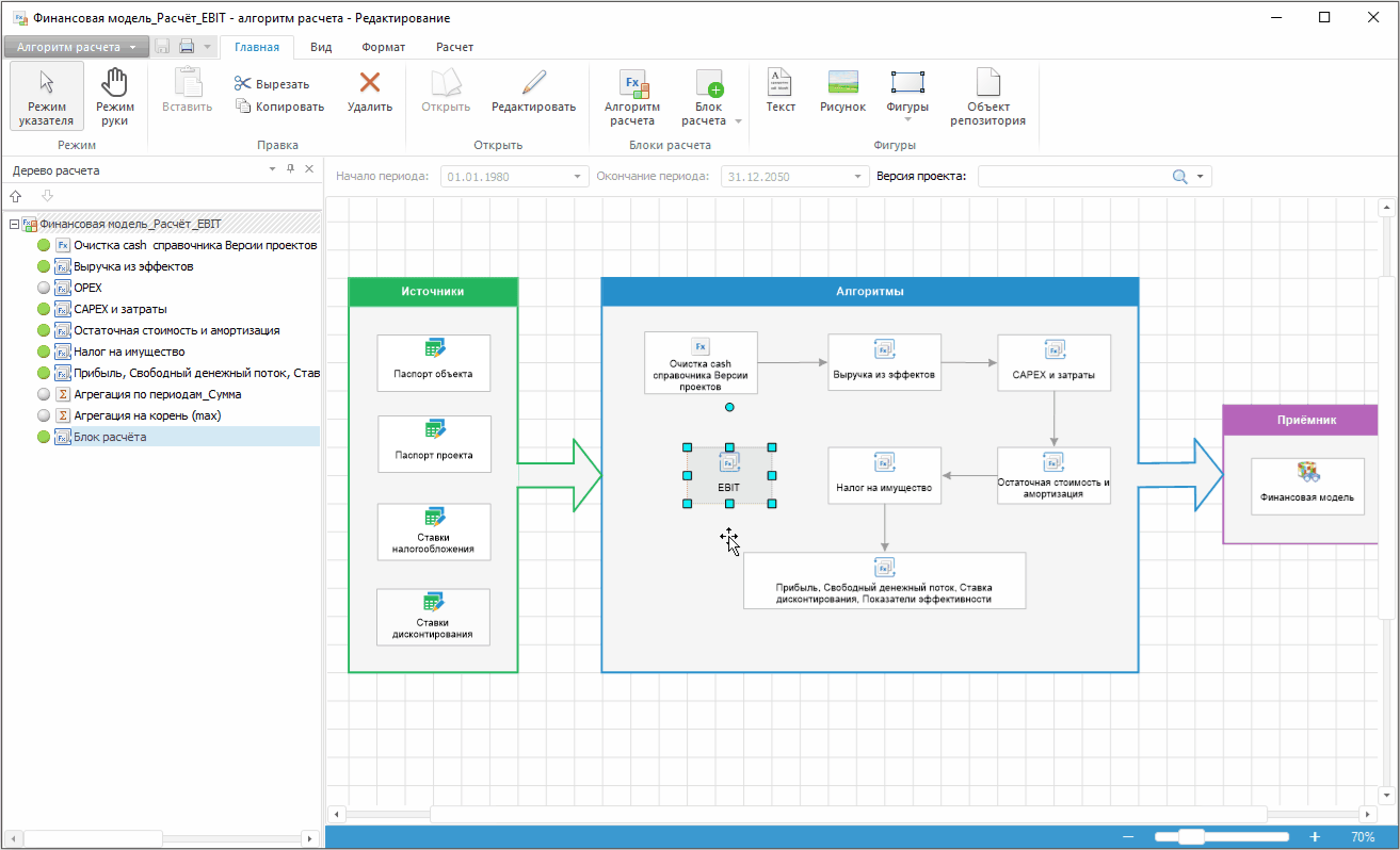 Для настройки алгоритма расчёта финансовой модели проекта, например добавления в модель расчёта показателя EBIT, выполните следующие шаги: