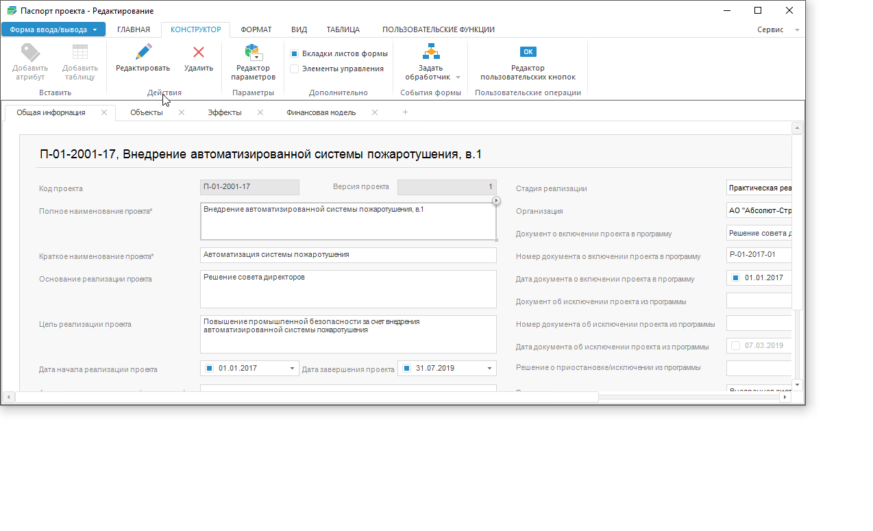 Для привязки алгоритма расчёта к форме ввода, в данном примере к паспорту проекта, выполните шаги: