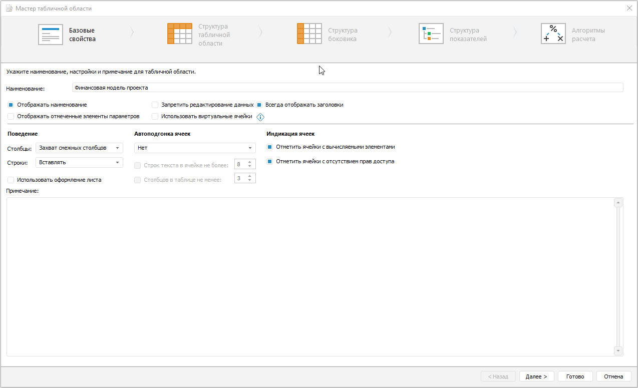 Откройте на редактирование паспорт проекта, перейдите на лист «Финансовая модель» и откройте мастер табличной области: