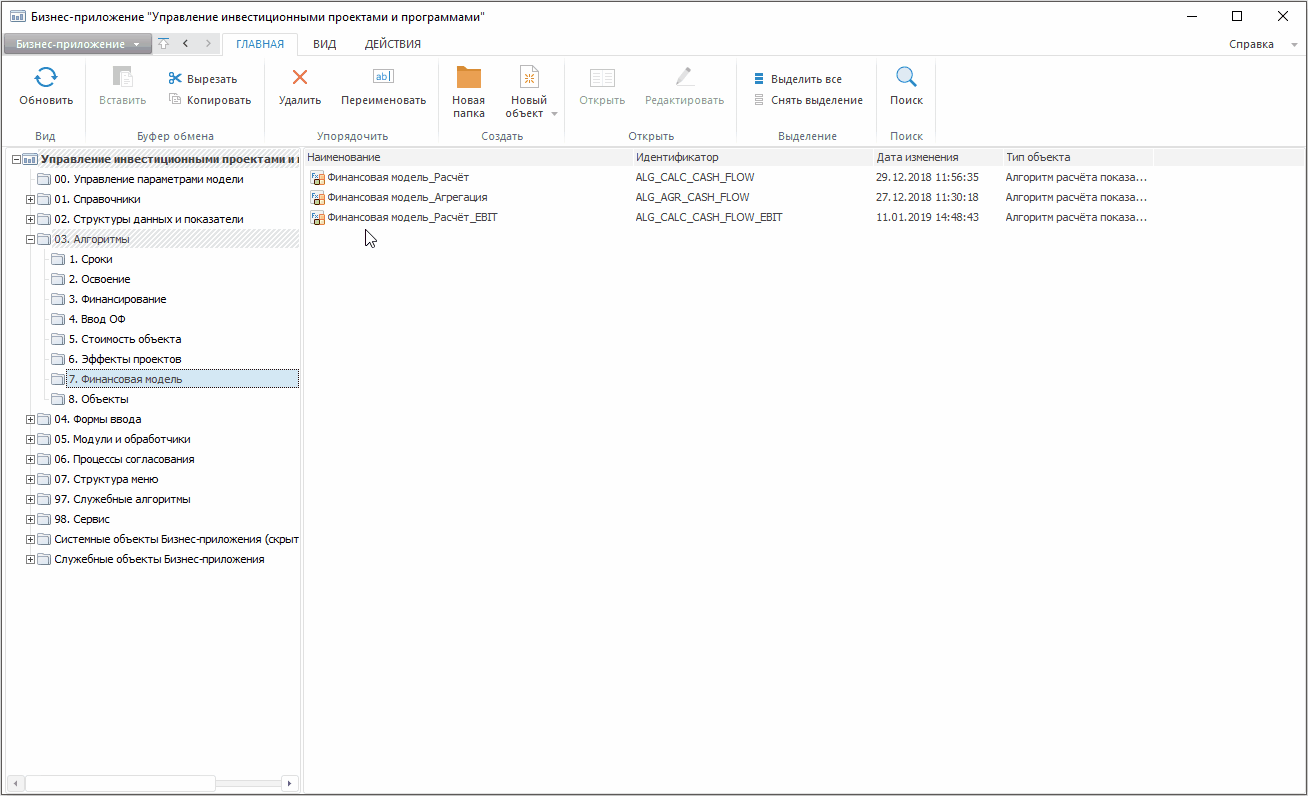По умолчанию в состав преднастроенной конфигурации программного продукта входят готовые алгоритмы, не требующие дополнительной настройки. Преднастроенные алгоритмы расчёта размещены в папке «03. Алгоритмы» настольного приложения продукта. Для удобства алгоритмы сгруппированы по группам показателей: ввод ОФ, освоение, сроки, стоимость, финансирование и т.п.