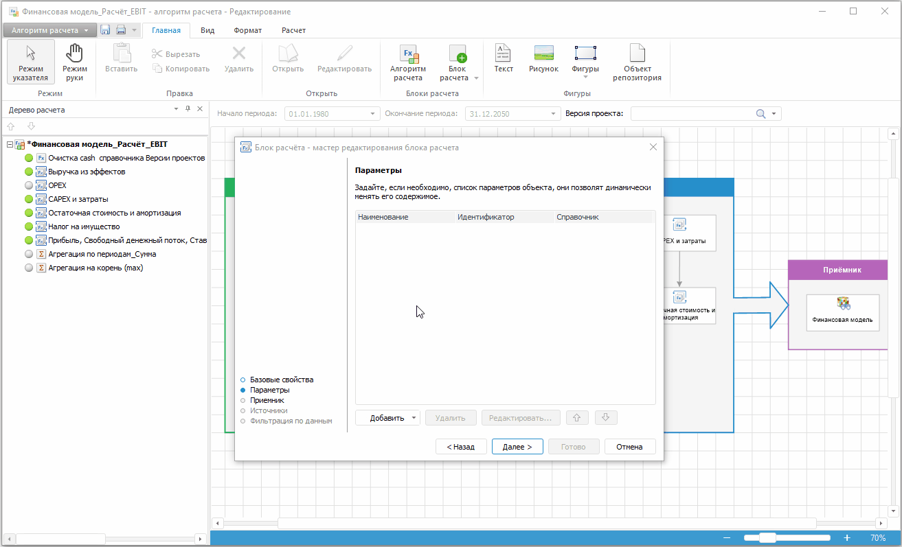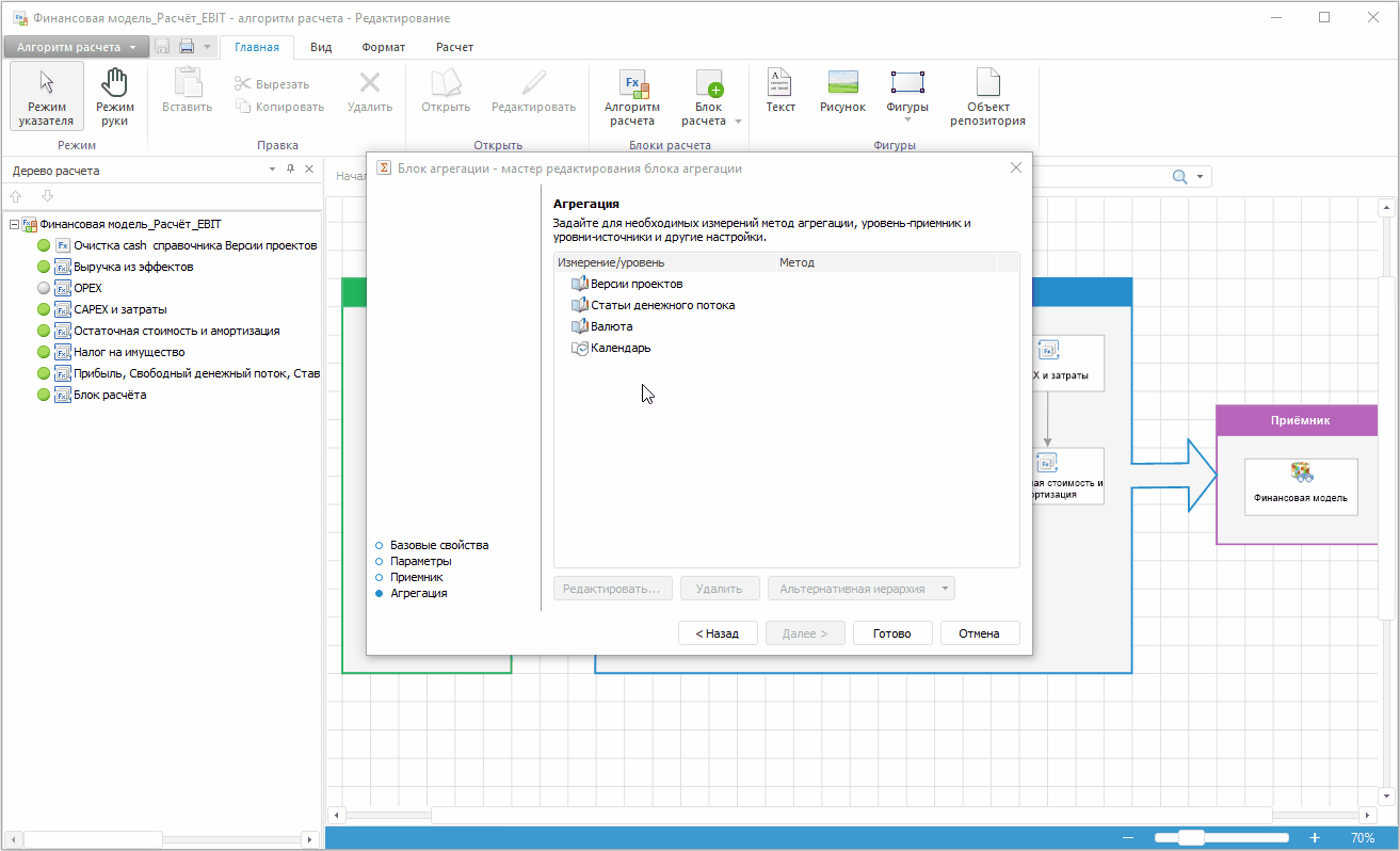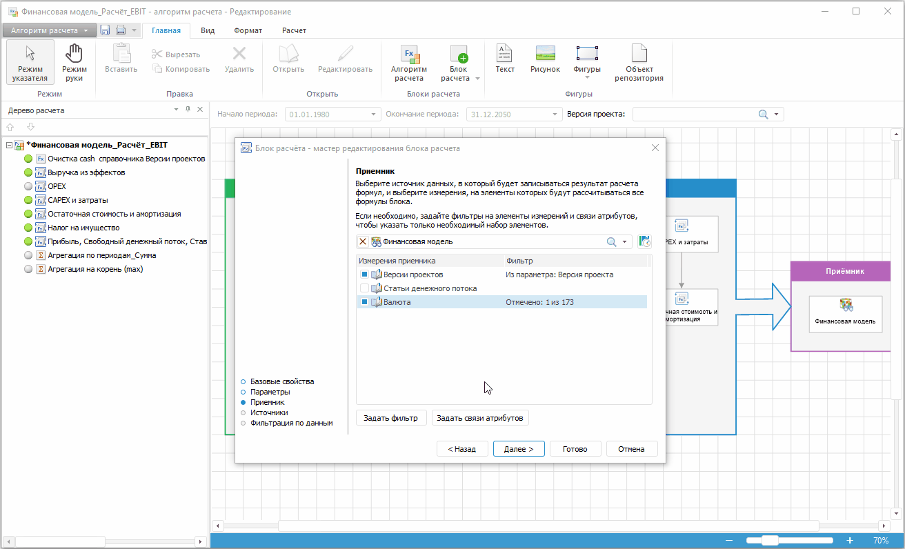 В качестве приёмника данных задайте показатель «Финансовая модель» аналогично блоку расчёта.