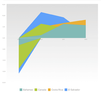 Диаграммы с областями используются для того, чтобы показать величину изменений с течением времени, а также, чтобы акцентировать внимание на суммарном значении в соответствии с тенденцией.