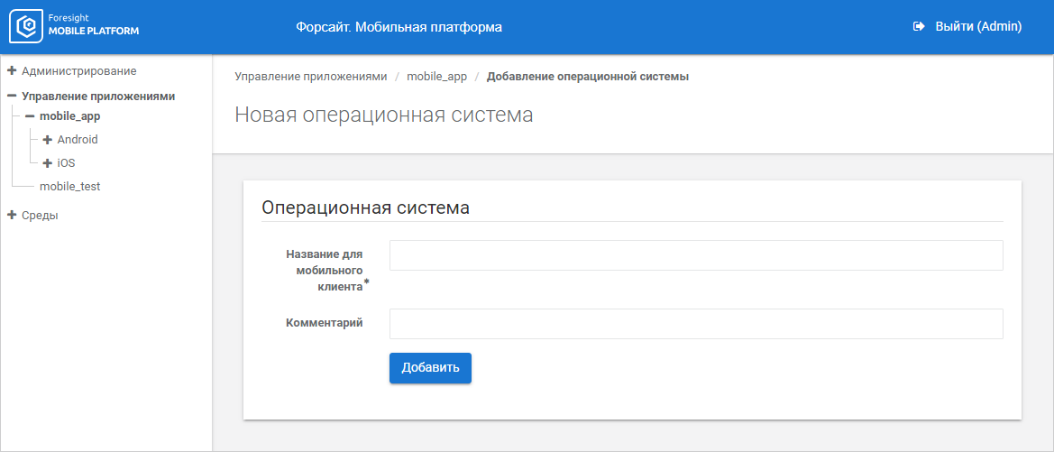 Название для мобильного клиента. Введите название контейнера операционной системы для мобильного клиента. Название должно состоять только из букв латинского алфавита, цифр, знаков подчеркивания или дефиса. Поле обязательно для заполнения;