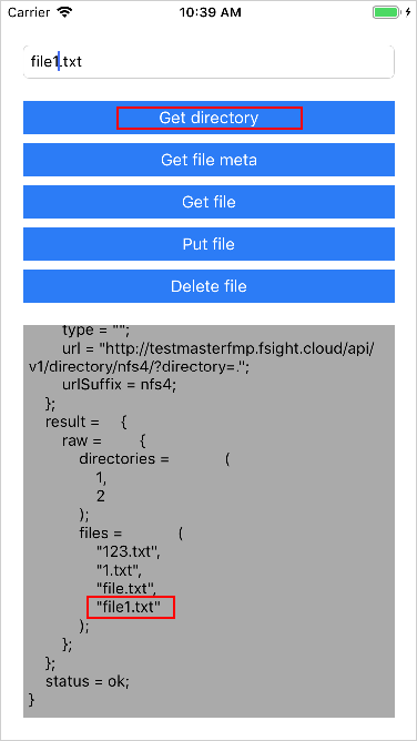 Проверьте удаление файла file1.txt с сервера мобильной платформы с помощью кнопки «Get directory».