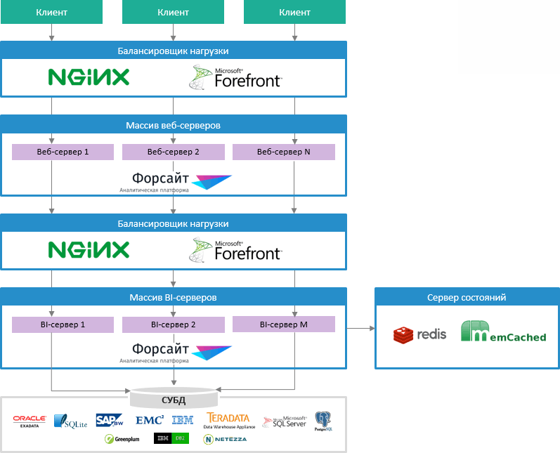 На базе нескольких BI-серверов продукта «Форсайт. Аналитическая платформа» можно развернуть отказоустойчивый кластер. Для этого понадобится балансировщик, сервер состояний и несколько BI-серверов, настроенных на работу с одним сервером состояний. Связь всех элементов кластера можно условно изобразить в виде следующей схемы: