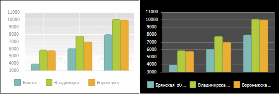 На примере отображена диаграмма с примененным строгим (слева) и контрастным (справа) стилем: