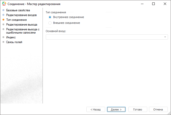 Внешнее соединение. В объект-приёмник заносятся все записи из источника, указанного в поле «Основной вход», а данные из остальных источников будут их дополнять. Связь объектов источников осуществляется по заданному индексу.