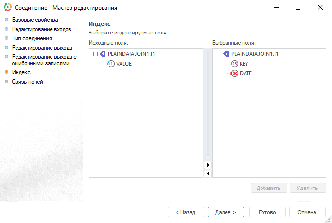 На странице «Индекс» определите индексируемые поля каждого входа. По значениям индексируемых полей происходит сопоставление данных в источниках.