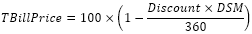 TBillPrice(Settlement: DateTime, Maturity: DateTime, Discount: Double): Double;