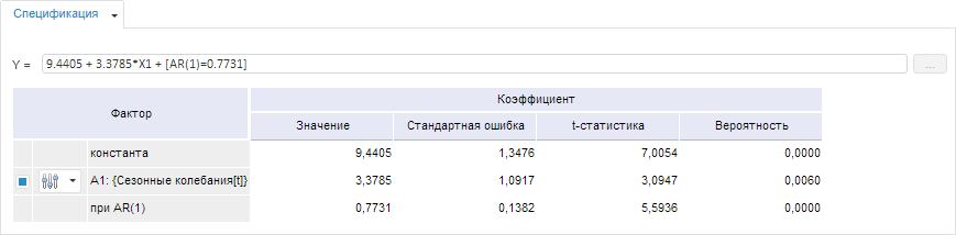 На вкладке «Спецификация» содержатся: идентифицированное уравнение с оцененными коэффициентами и таблица коэффициентов.