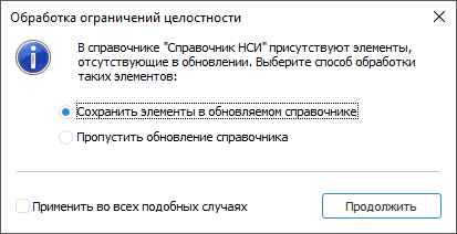 в процессе обновления таблицы или справочника НСИ, в случае если в обновляемом объекте присутствуют элементы/записи, отсутствующие в обновлении и на которые есть ссылки из других справочников, то может быть выдан диалог: