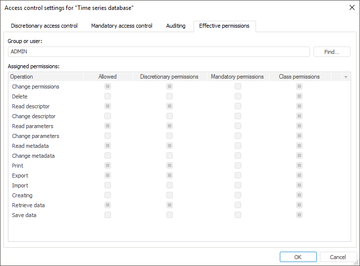 If attribute-based access control is used simultaneously with discretionary access control, allowing of operation in the Allowed/Summary column depends on the selected permissions combination algorithm: