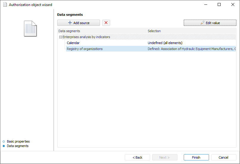 The next wizard page, Data Segments, is used to determine the list of data segments. Data segments are set by determining selections by dimensions of the selected source. It enables dividing data source into segments available for singnle groups of users work.