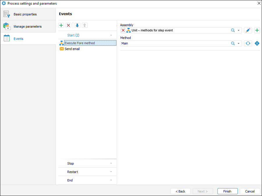 Set up automatically executed operations started when one of events occurred: starting process execution, stopping process steps execution, restarting process steps, finishing process execution.