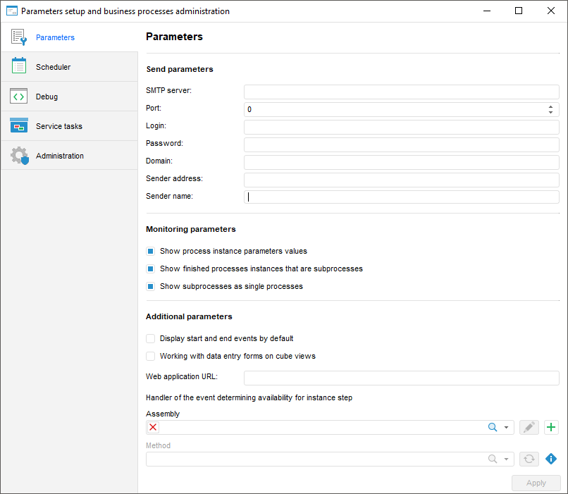 Setting Up Process Parameters | Setting Up Business Processes Parameters | Setting Up Business Processes Scheduler | Setting Up Business Processes Debug | Creating Service Tasks for Business Processes | Administrating Business Processes