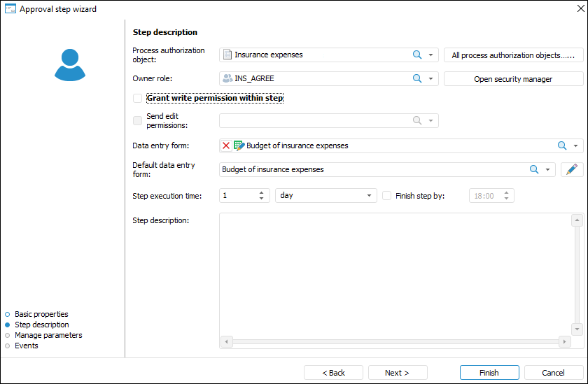 NOTE. To correctly execute the step and display processes tree in data entry form – selection by dimensions of data entry form must be fully contain selection by dimensions of authorization boject that is used in process step.