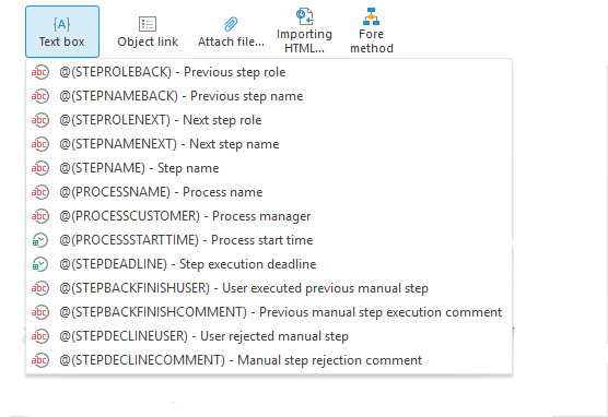 Text Field. It opens the list of available variables. Variables values are generated depending on unique parameters of each process instance: