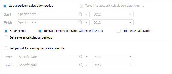 Select the Consider Algorithm Calculation Period checkbox if required. The checkbox is deselected by default, a formula is calculated only by the specified period. When the checkbox is selected, a formula is calculated taking into account the intersection between formula calculation and algorithm calculation period.