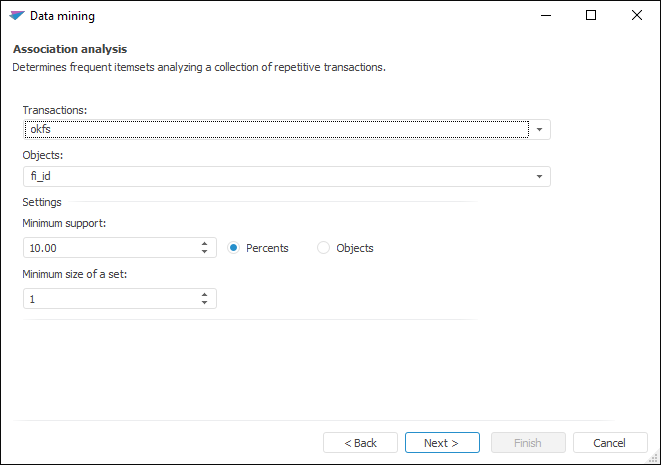 In other words, the purpose of this analysis is establishing the following dependencies: if an X set of elements is found in the transaction, it can be concluded that another Y set of elements should also be found. Establishing these dependencies enables finding simple and intuitive rules.