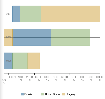 The value of each element is displayed as a horizontal bar, which length is proportional to the element value. A custom set of bars is displayed for each of the data groups; data series are highlighted by the bar color.
