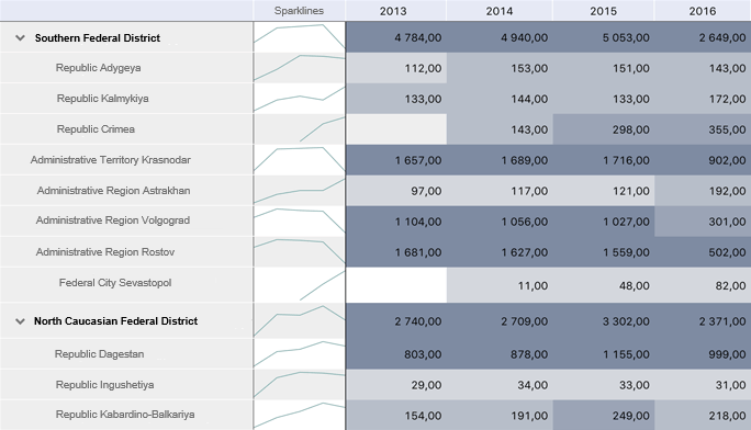 The Sparklines column is added before the first table column, this column cells will contain charts displaying data series trends: