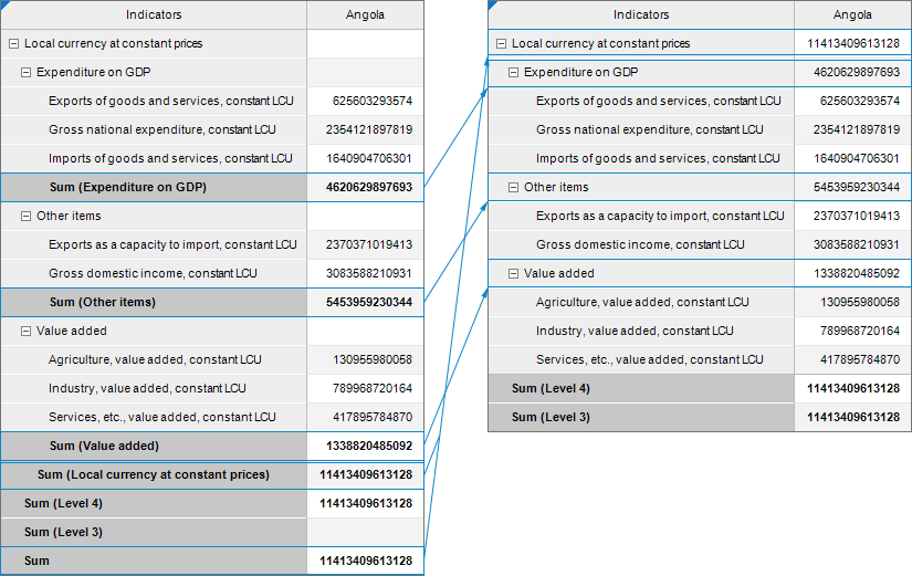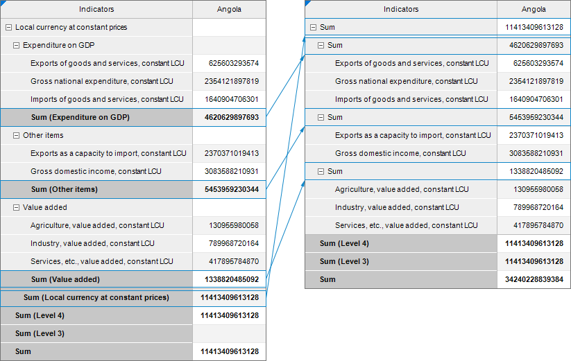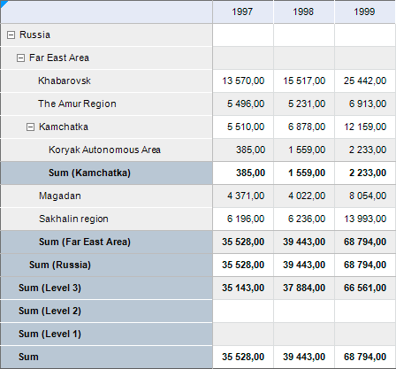 To set up display parameters of totals in the parent element string, select one or both checkboxes. The setting is separate for row and column totals.