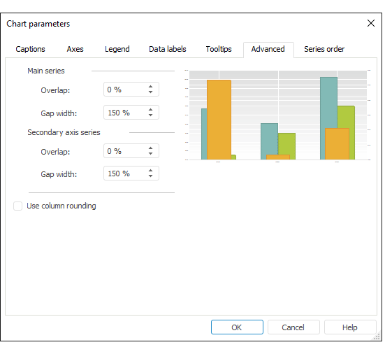 The tab is used to set up gaps between series. For details, see the Setting Up Gaps Between Series section. The main series gap width setup is only available for waterfall charts.