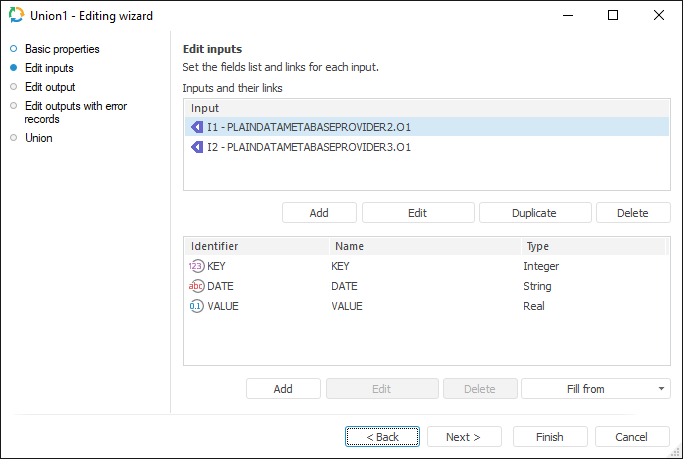 The Union transformer is an object that merges data. Each of the objects has several inputs and a single output. Each provider should have a unique index, number and types of fields. The specified attributes should be identical for all providers. Duplicate records are not allowed (duplicates must be deleted beforehand).